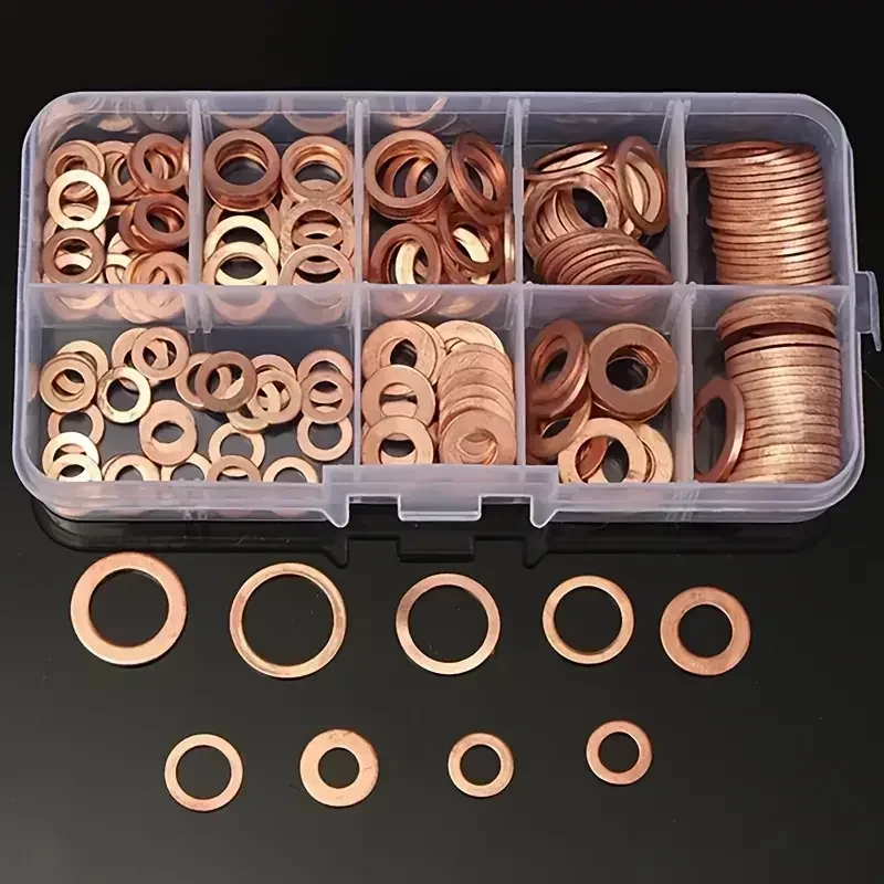 3.100pcs solid copper plug gasket set is all packed in a compact transparent plastic box.