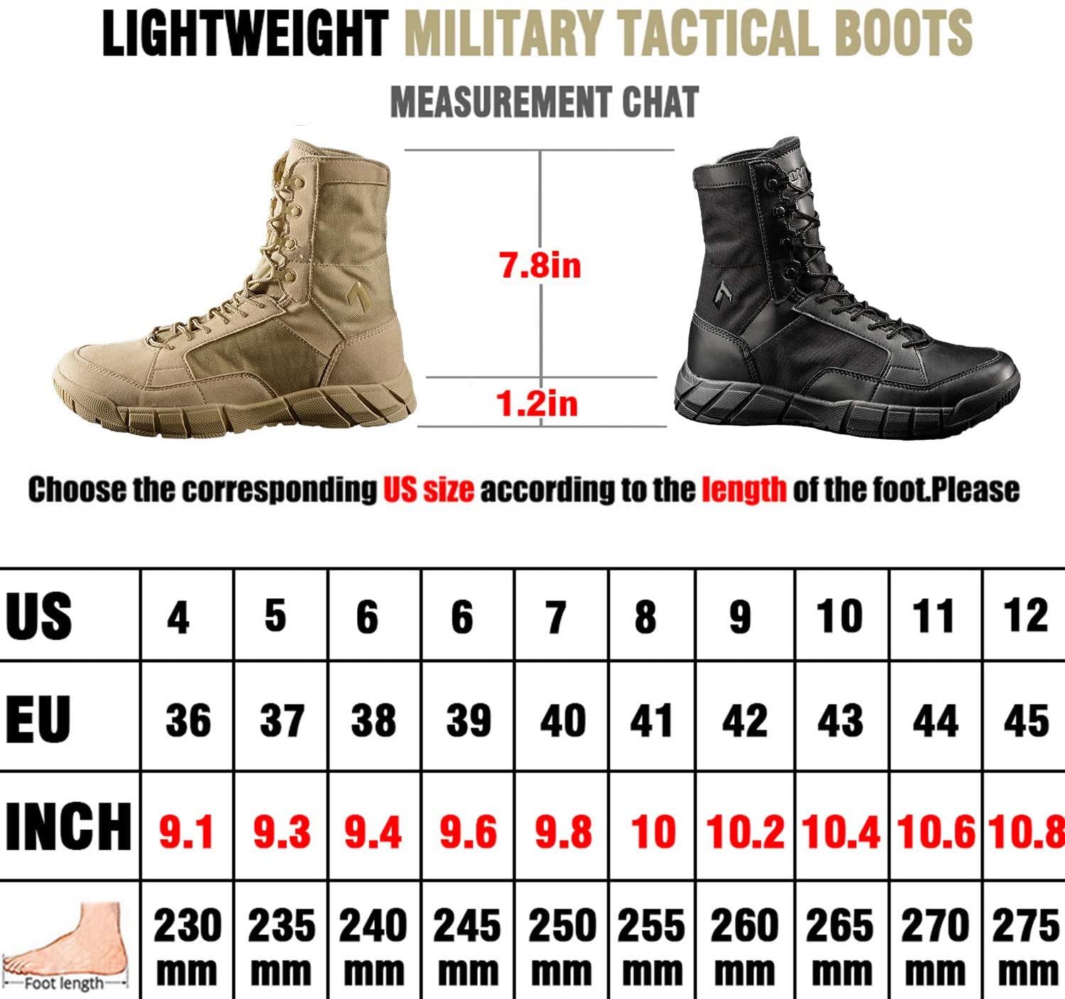 - *FIT & DURABLE - Made of US size. Inside with flexible lycra cloth, comfortable and wear-resistant. Suede leather toe cap. Ankle boot's tongue prevents pebbles, sand, dirt and other debris from entering your tactical shoes.