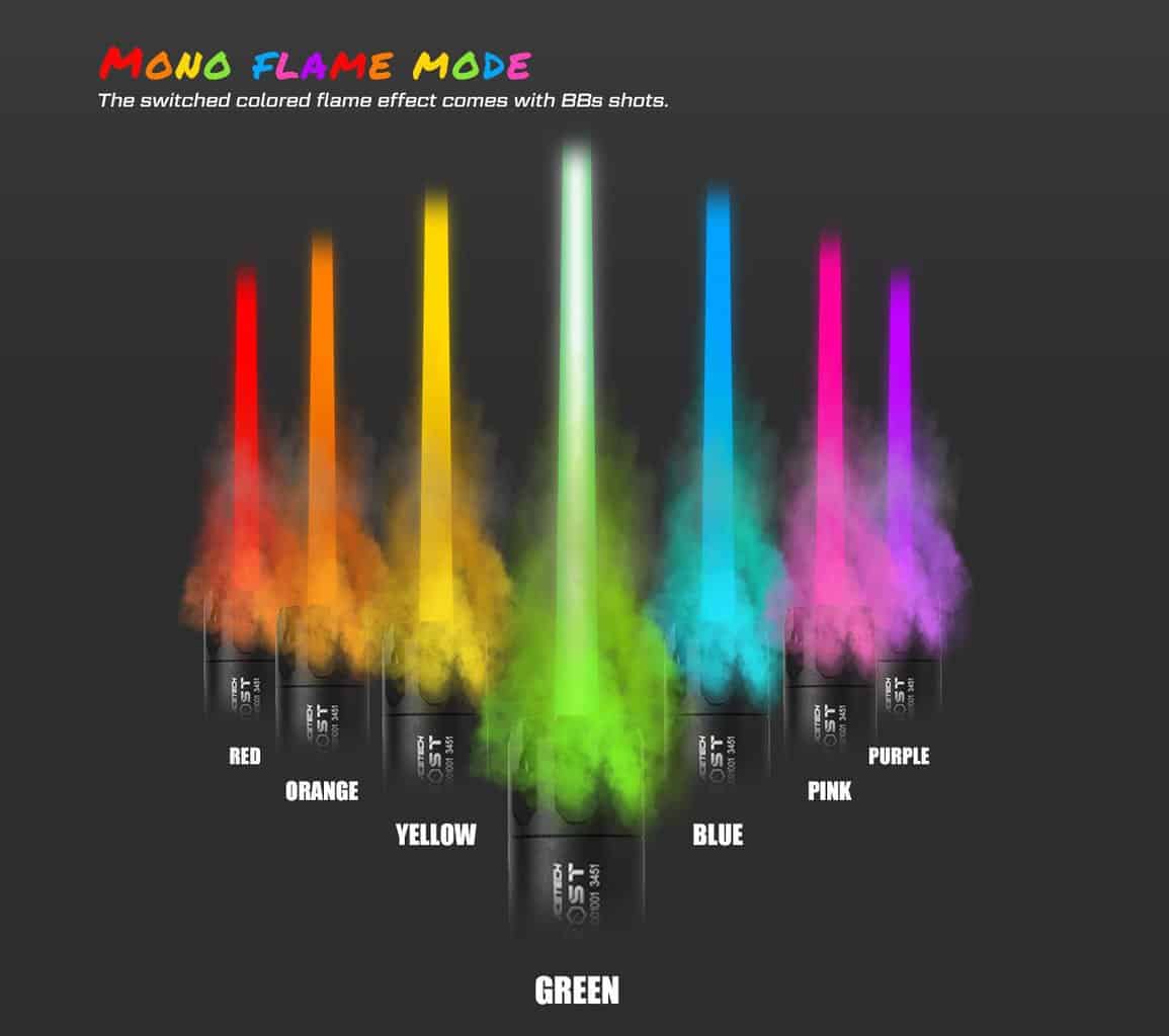 - Bifrost simulates muzzle flash, with a Multi-color flame effect. The effect of the flame depends on the volume of gas or fog around the muzzle, more volume makes a better effect. 2. Bifrost provides coloured BBs track function which can be achieved by standard BBs with the built-in RGB Flame LED. 3. Two tracer modes available - Standard/Sniper. 4. 11 different modes available for Multi-color flame function. 5. Intelligent power control: Blaster Module power on by shaking, enter sleep mode while idle for over 5 minutes. 6. Suitable for standard airsoft and gel BBs. Specification: Diameter: 30mm Length:81mm Weight: 61g without adapter Thread: M14- / M14- to M11+ Supports: Green Tracer BBs, Gell BBs RPS: Up to 35RPS Battery: Li-Poly Battery USB-C Charging