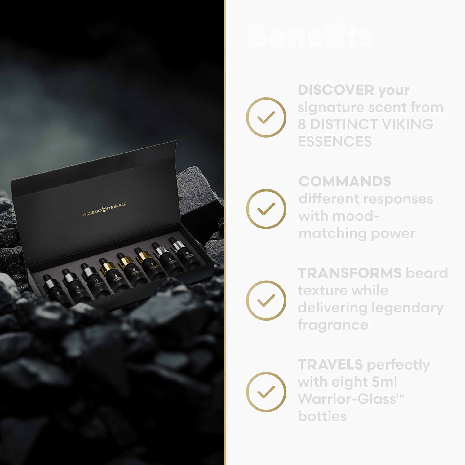 Discover 8 bold, cologne-grade fragrances—each inspired by Norse legends and packed in a 5ml Night Liquid Elixir bottle (40ml total). Find your favorite or switch it up daily—your beard will thank you.