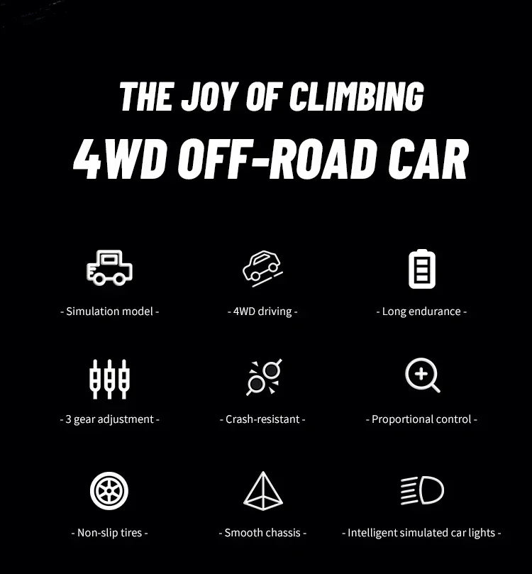 - 4WD Power & 45° Slope Climbing Ability: Equipped with a robust 4-wheel-drive system, the C8809 effortlessly conquers steep inclines up to 45 degrees, making it perfect for adventurous off-road challenges.