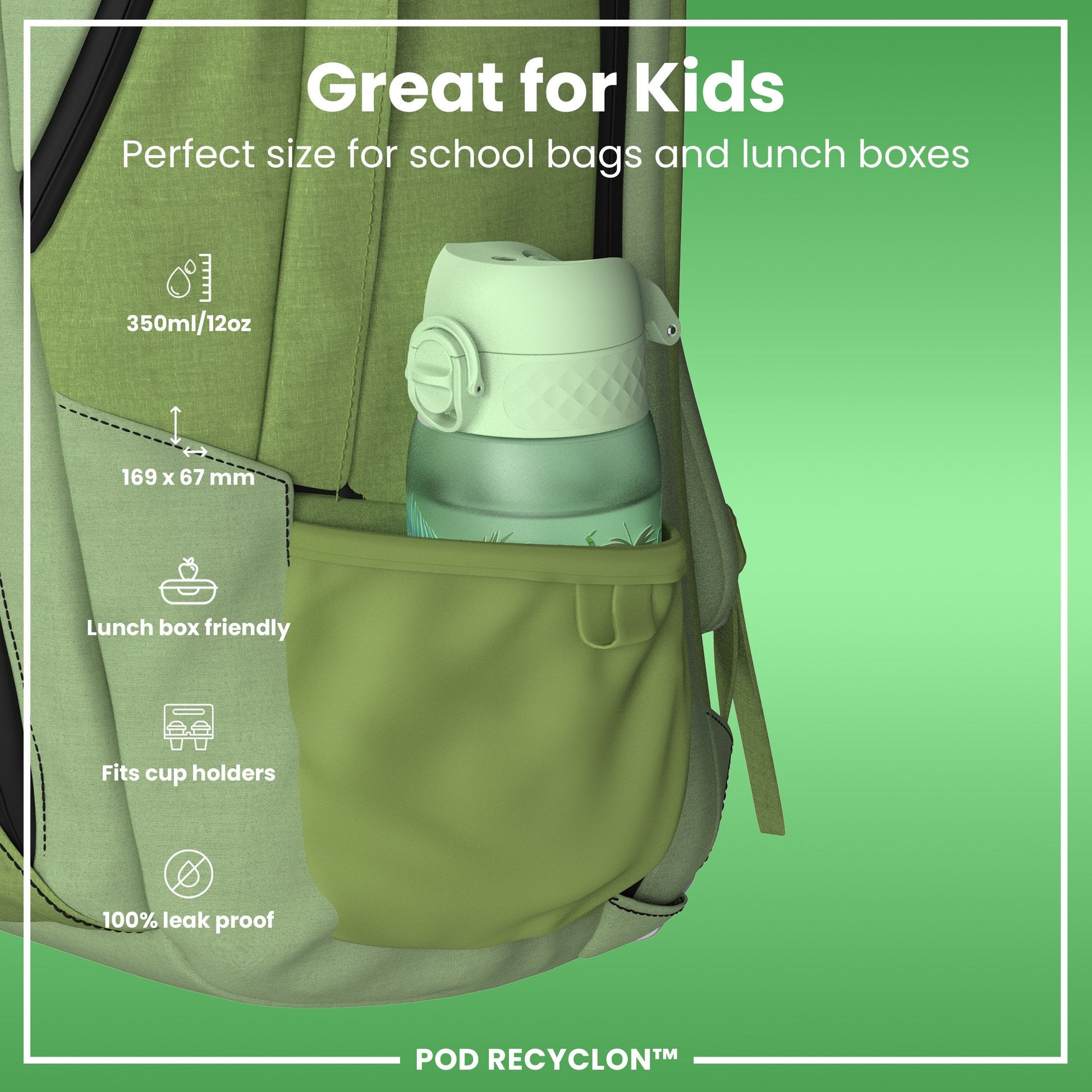 Small enough as a kids water bottle for their school lunch boxes or for smaller bags about town. The width of a soda can, it fits perfectly into all car cup holders and pockets on all backpacks.