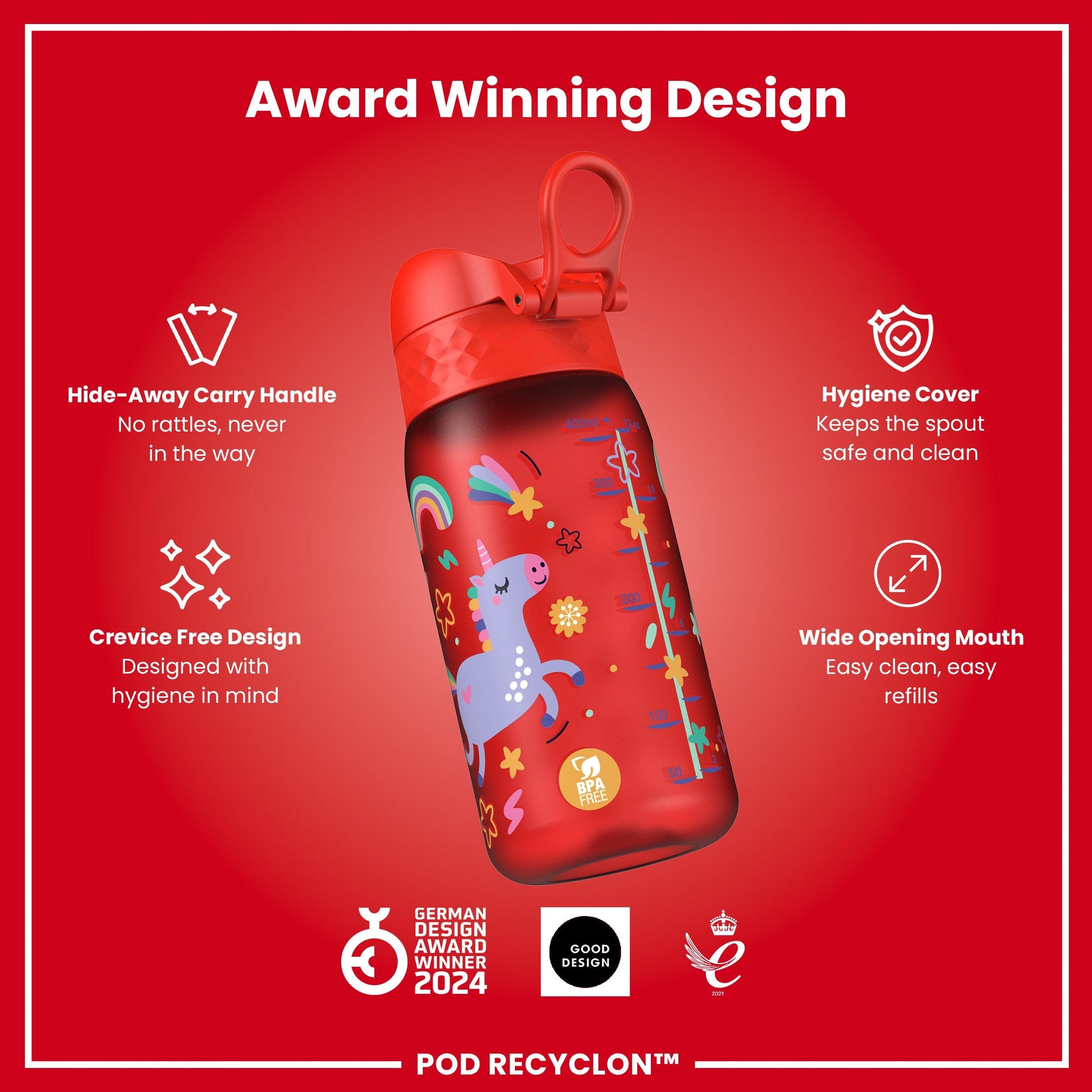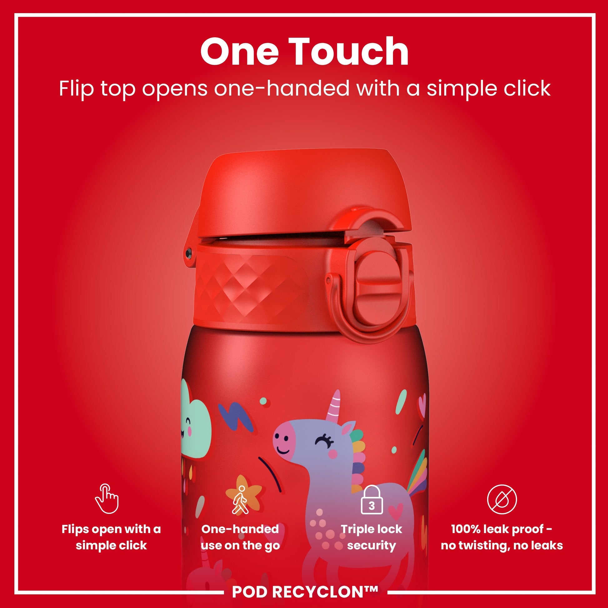 Leak Proof Kids Water Bottle, Recyclon, Red Unicorns, 350ml (12oz)