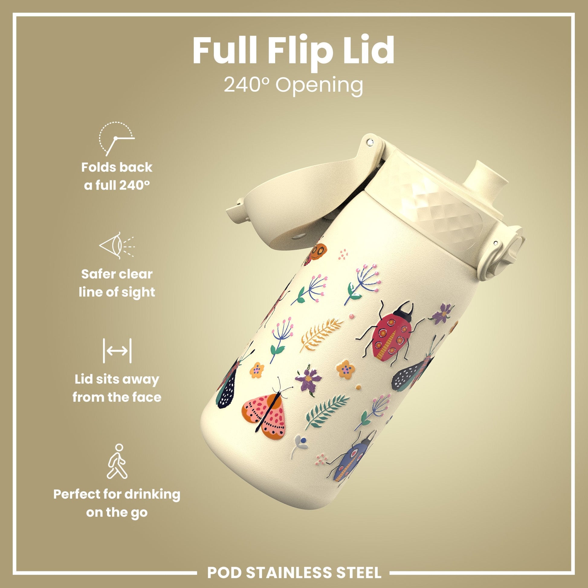 100% leak proof 400ml / 13oz stainless steel water bottles with a smooth flow for spill-free hydration and hygienic full-flip top cover for one handed use on-the-go.