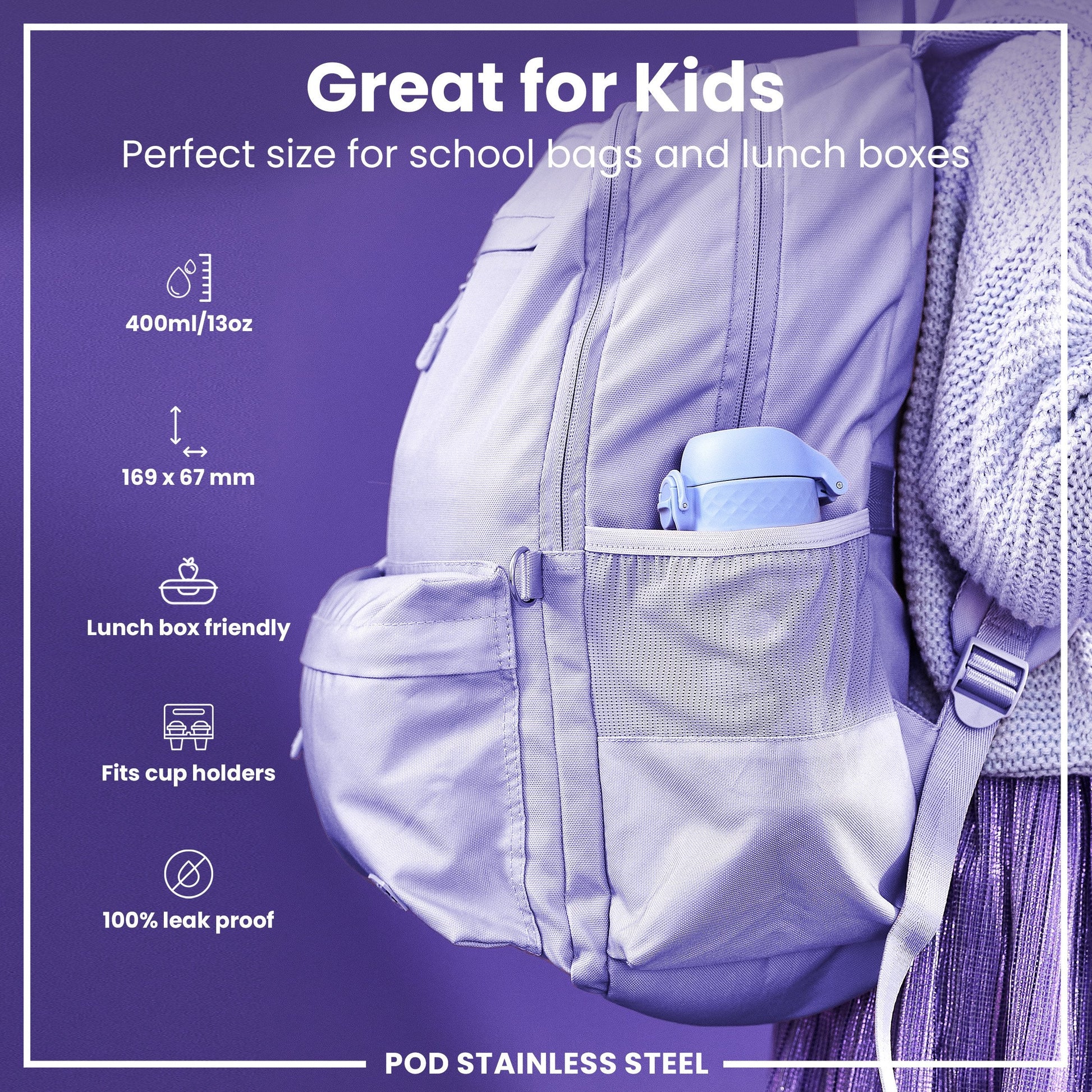 100% leak proof 400ml / 13oz stainless steel water bottles with a smooth flow for spill-free hydration and hygienic full-flip top cover for one handed use on-the-go.