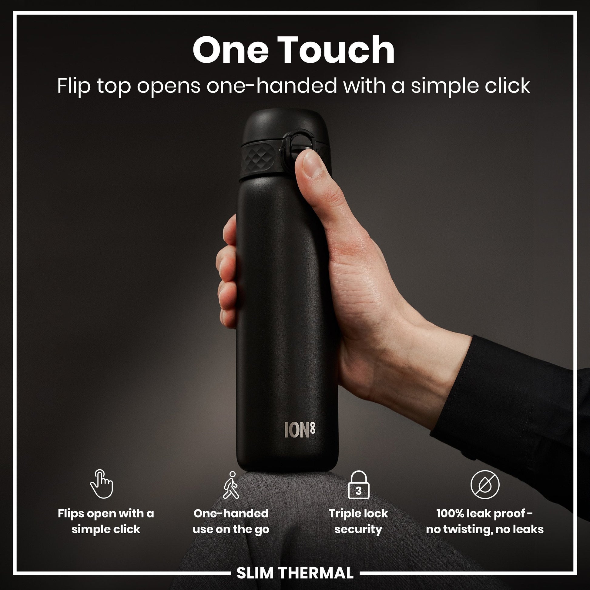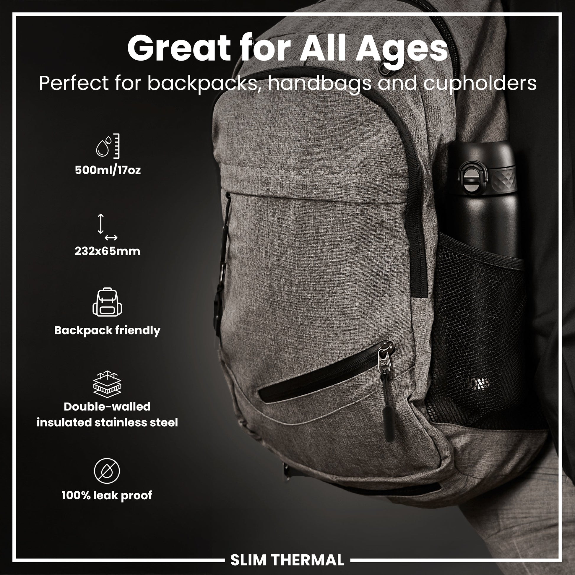 Leak Proof Slim Thermal Steel Water Bottle, Insulated, Black, 500ml (17oz)