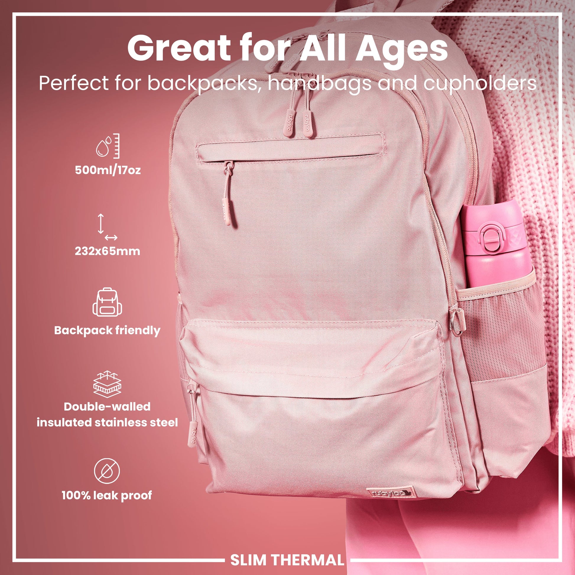 Leak Proof Slim Thermal Steel Water Bottle, Insulated, Rose Bloom, 500ml (17oz)