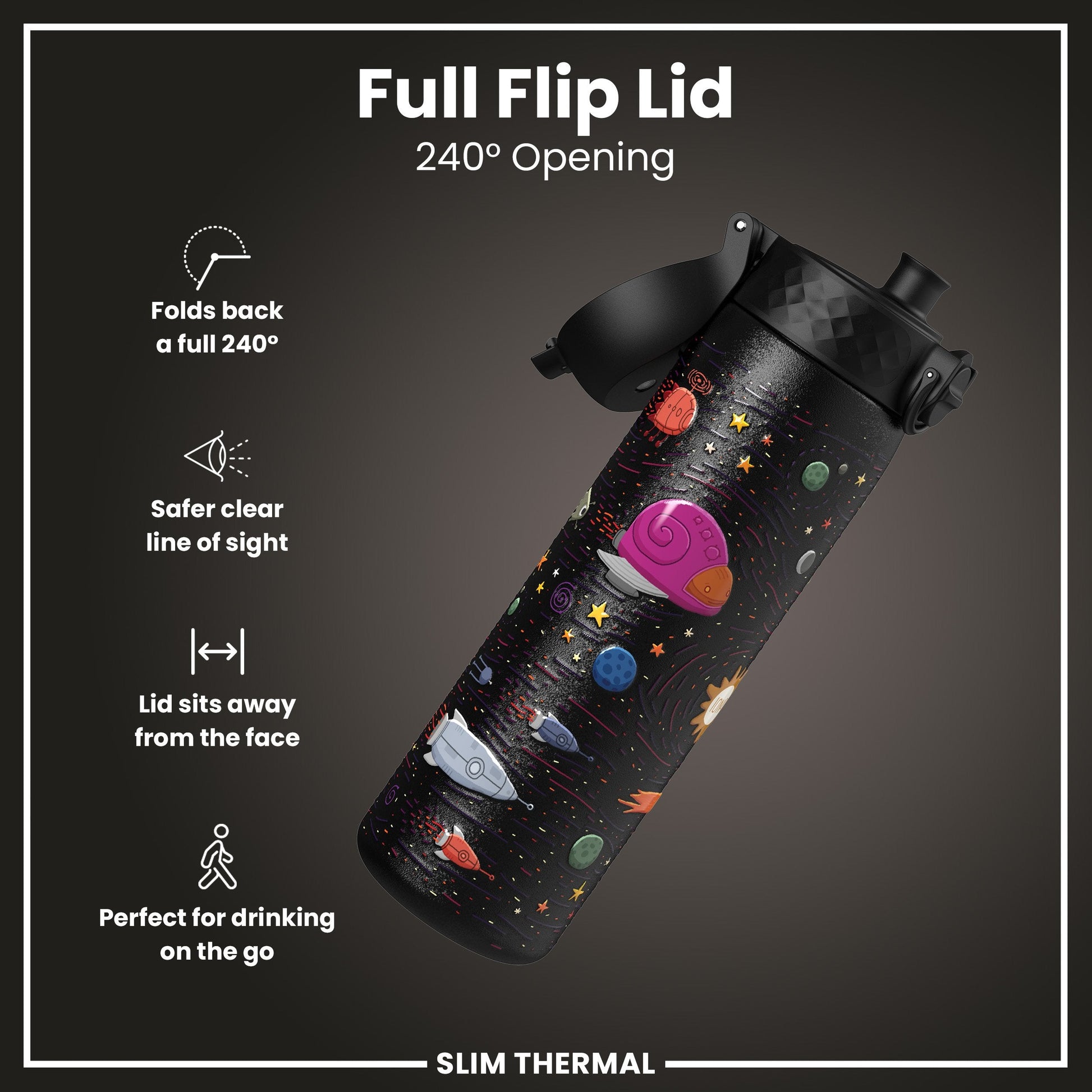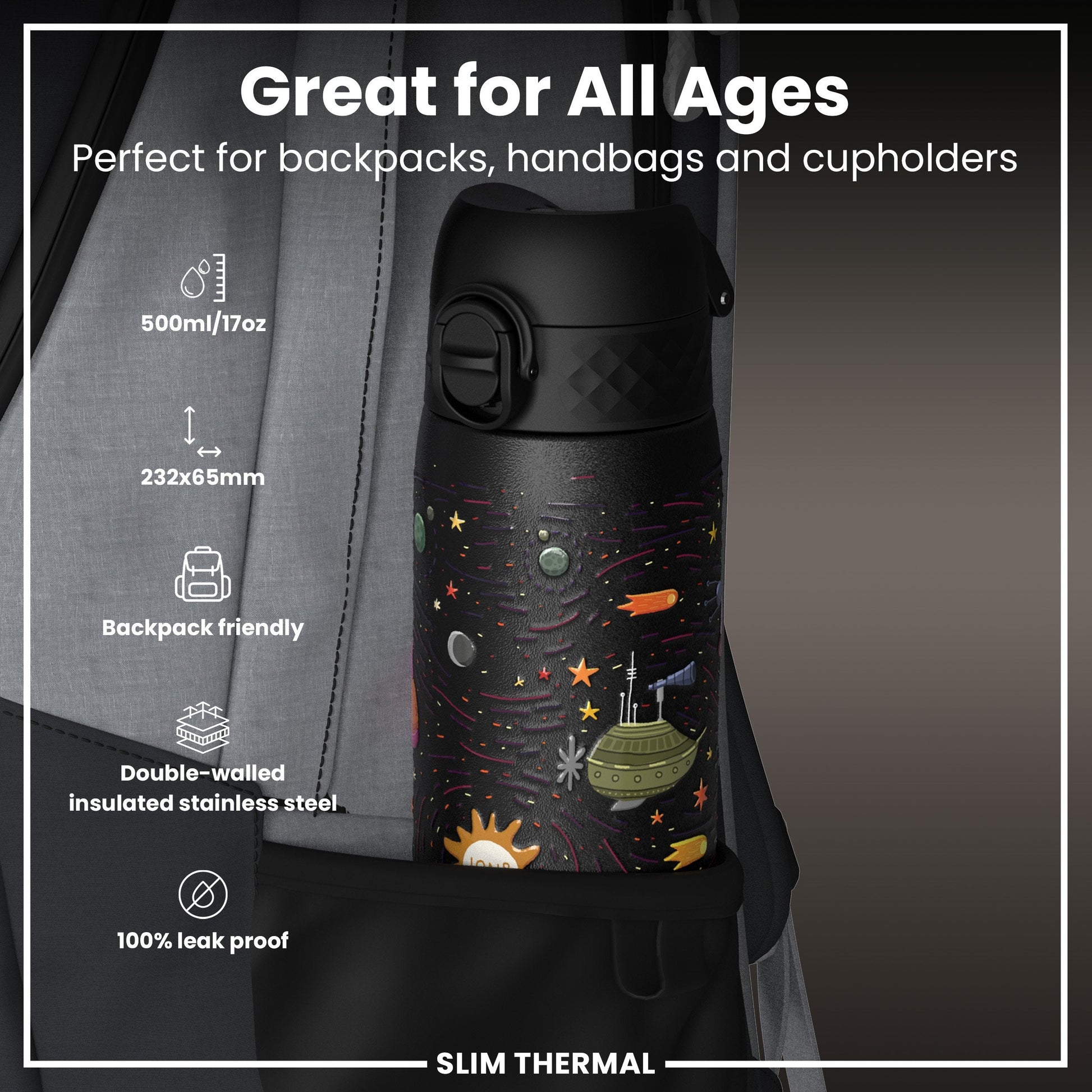 Leak Proof Slim Thermal Water Bottle, Insulated Steel, Spaceships, 500ml (17oz)
