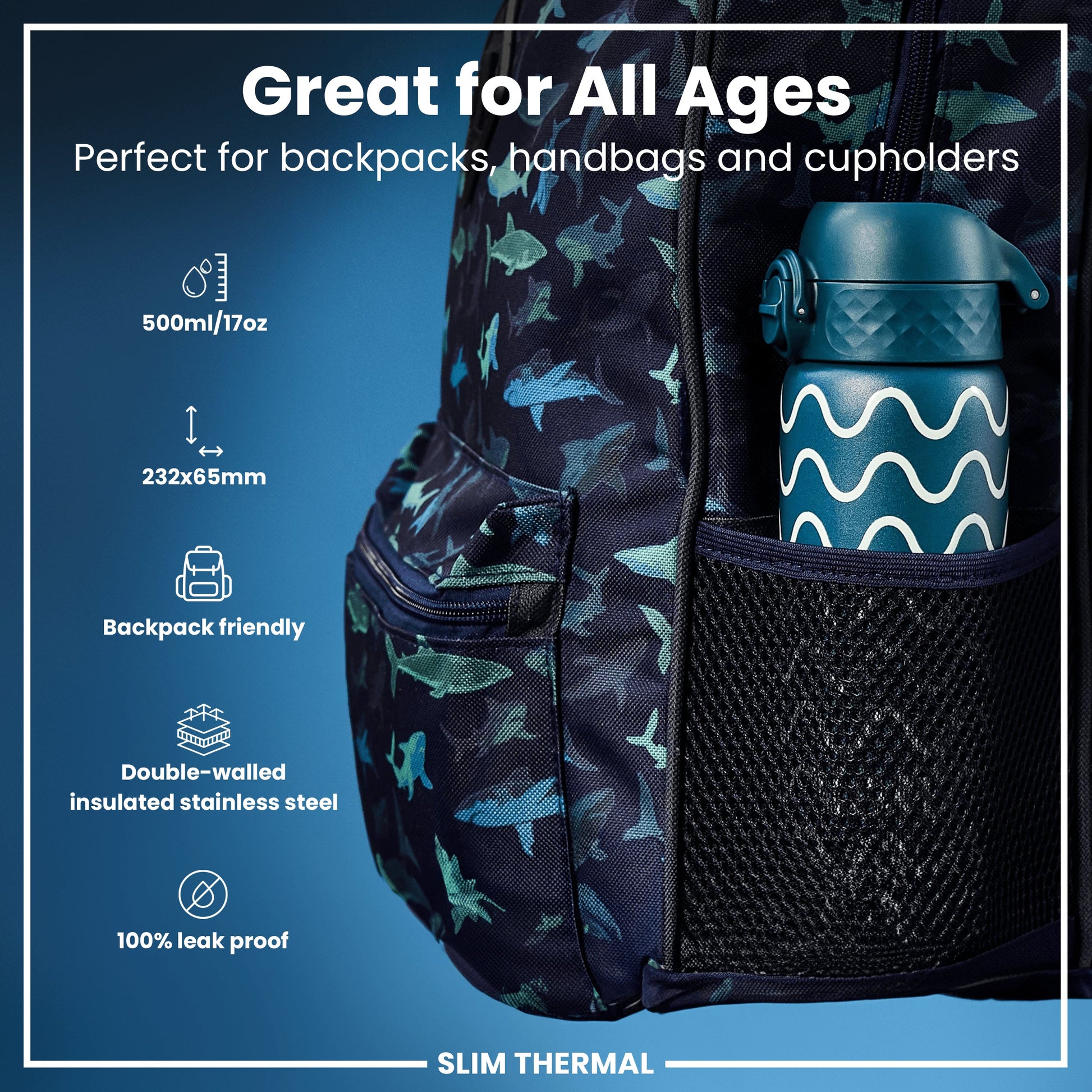 Leak Proof Slim Thermal Water Bottle, Insulated Steel, Wave, 500ml (17oz)