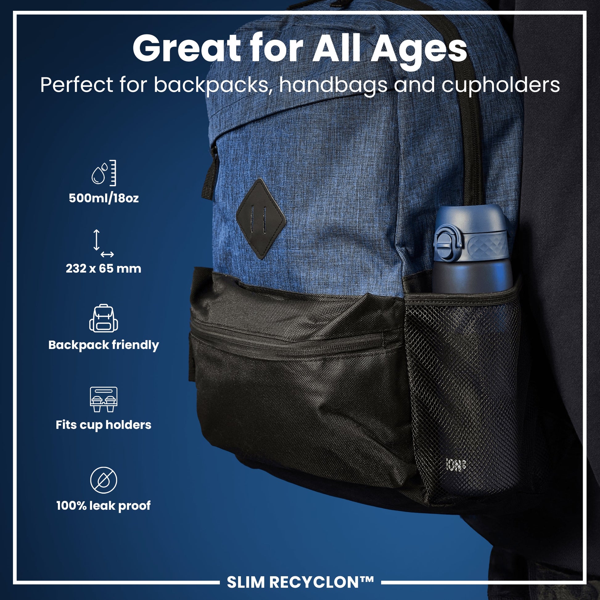 Leak Proof Slim Water Bottle, Recyclon, Navy, 500ml (18oz)
