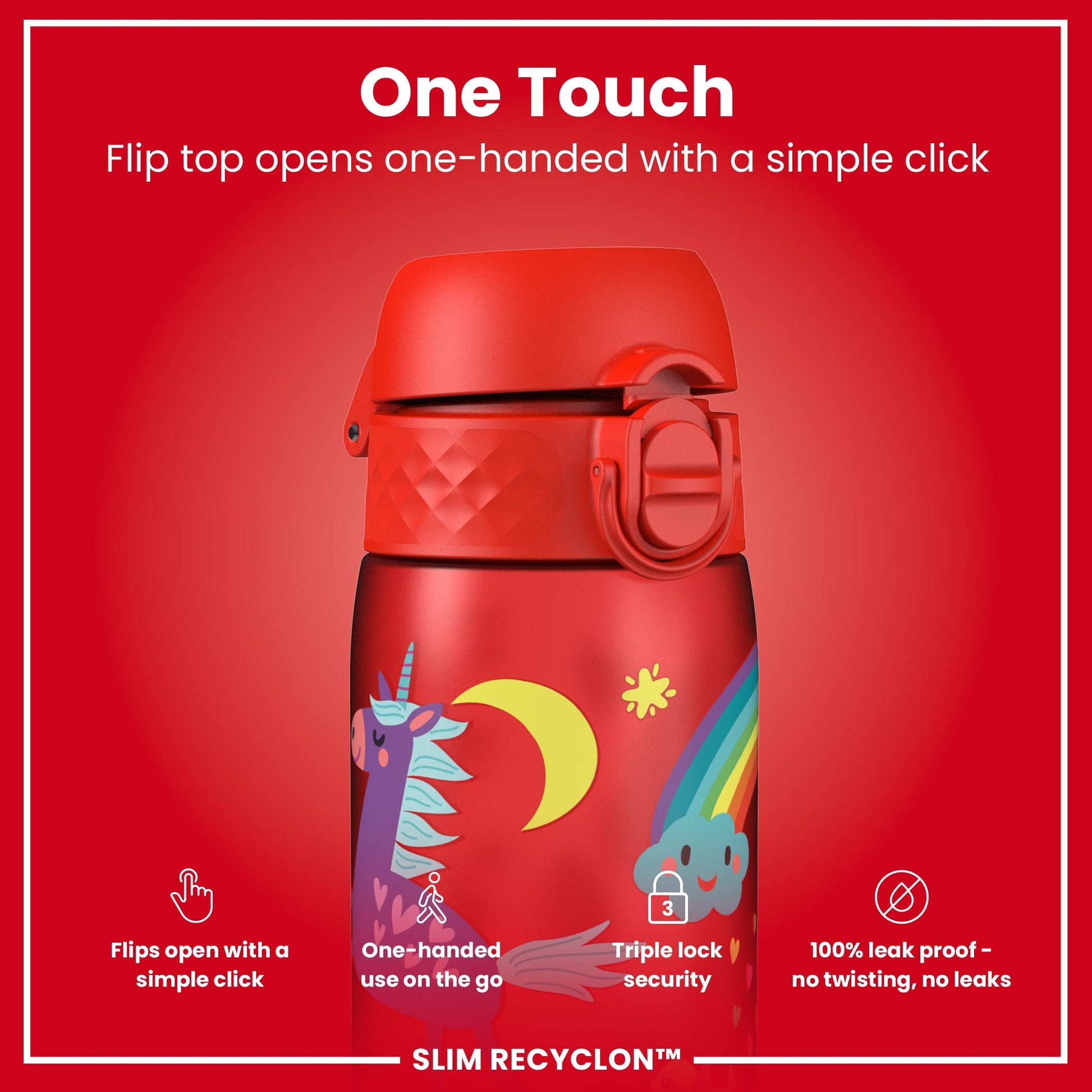 Leak Proof Slim Water Bottle, Recyclon, Red Unicorns, 500ml (18oz)