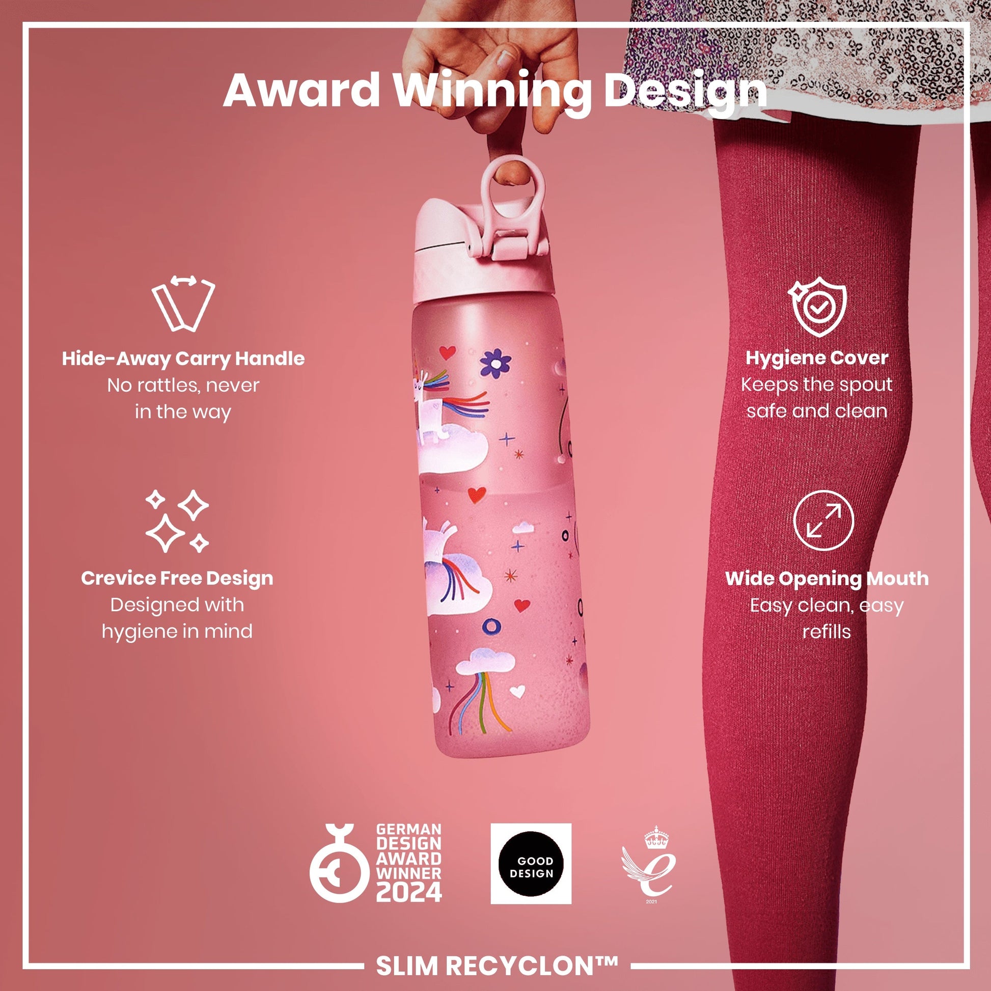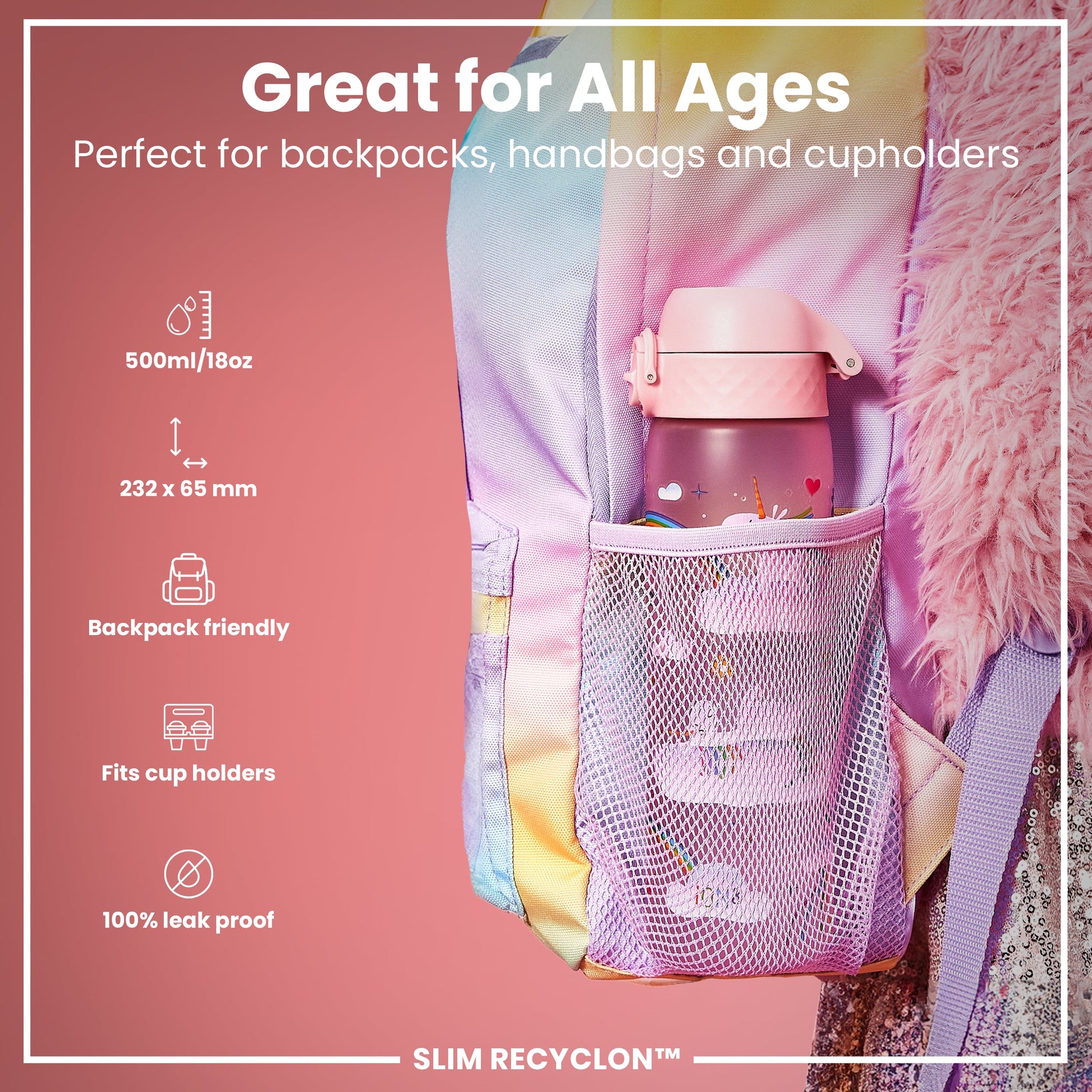 Leak Proof Slim Water Bottle, Recyclon, Unicorn Rainbows, 500ml (18oz)