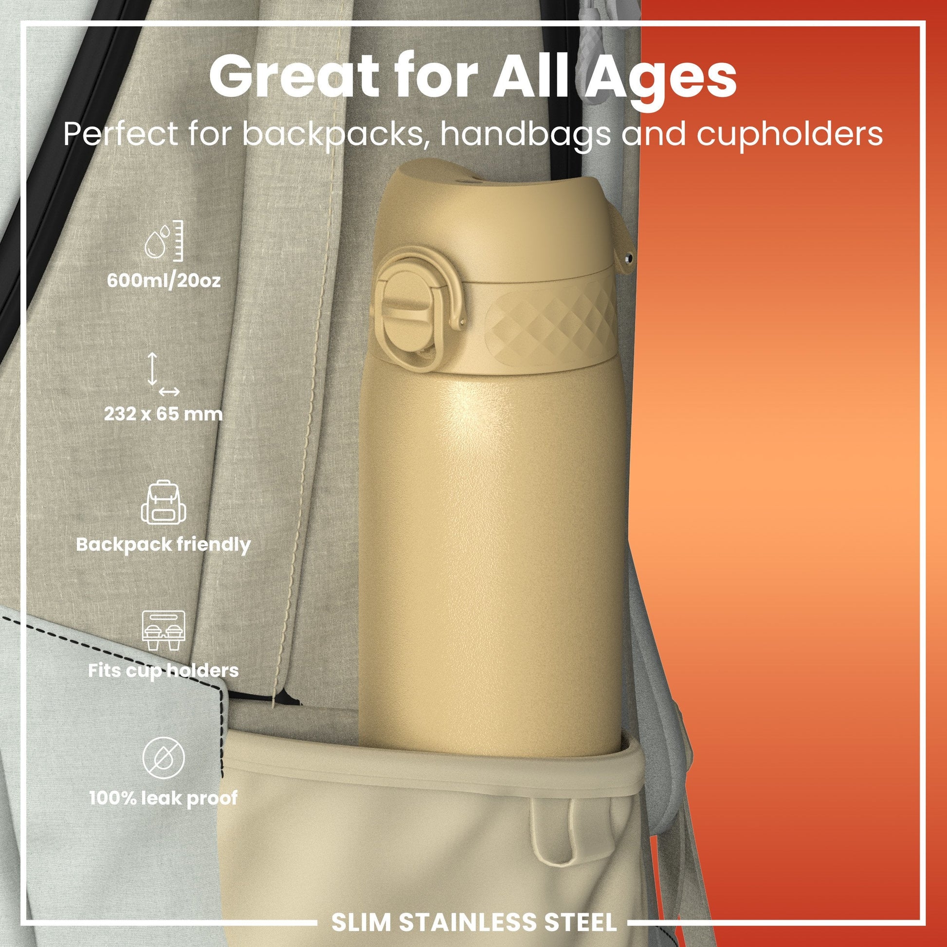 Leak Proof Slim Water Bottle, Stainless Steel, Desert, 600ml (20oz)