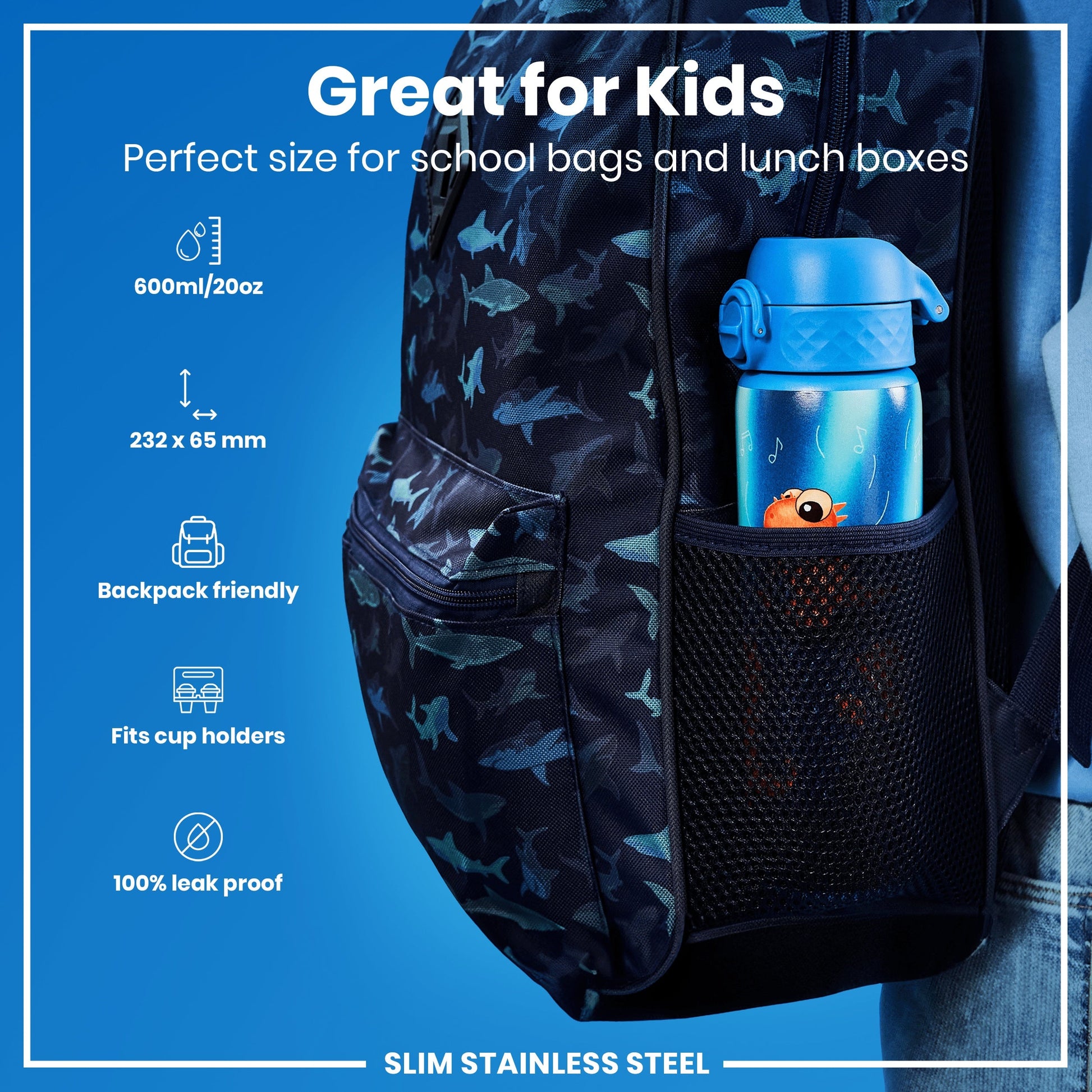 100% leak proof 600ml / 20oz stainless steel water bottles with a smooth flow for spill-free hydration and hygienic full-flip top cover for one handed use on-the-go.