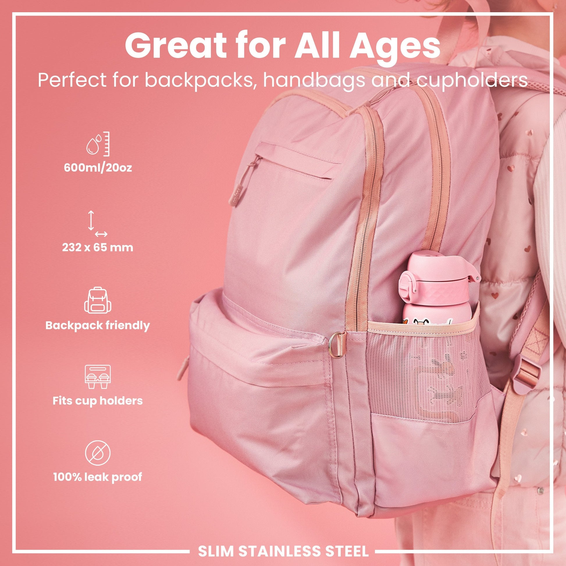 100% leak proof 600ml / 20oz stainless steel water bottles with a smooth flow for spill-free hydration and hygienic full-flip top cover for one handed use on-the-go.