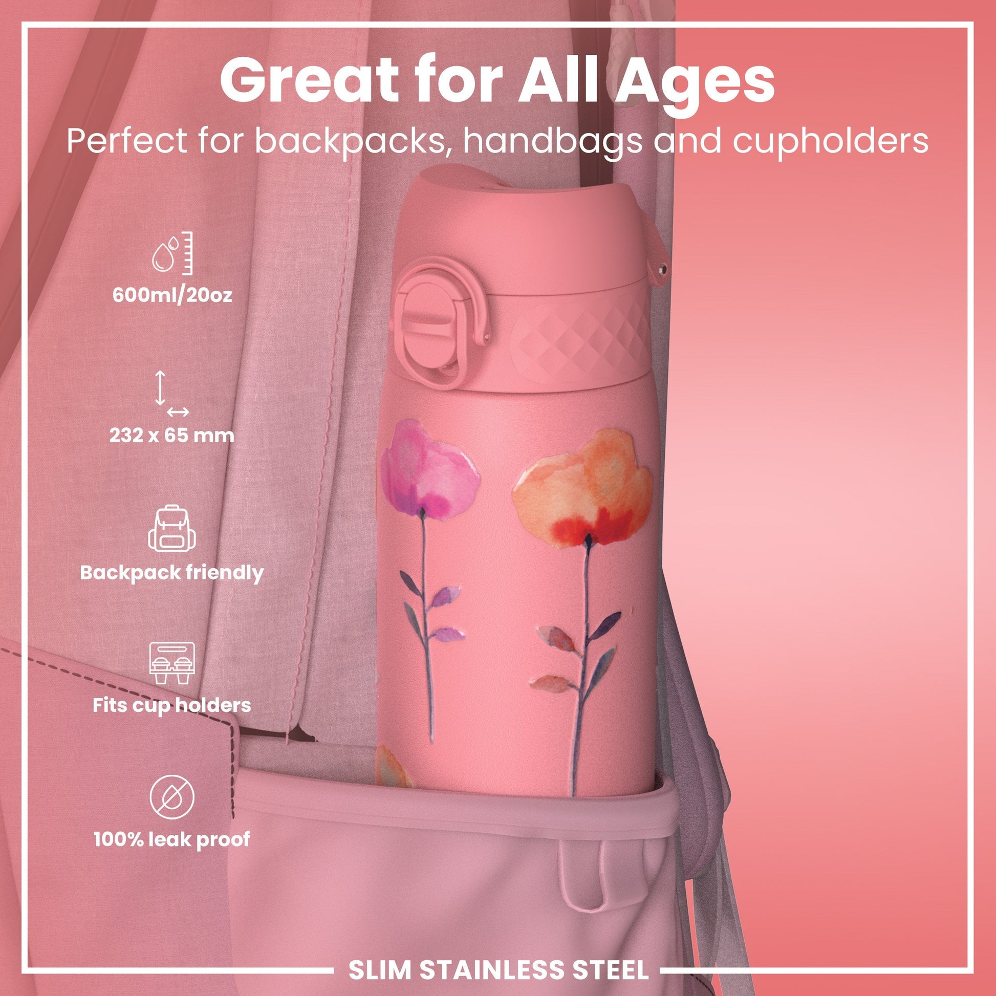 Leak Proof Slim Water Bottle, Stainless Steel, Flowers, 600ml (20oz)