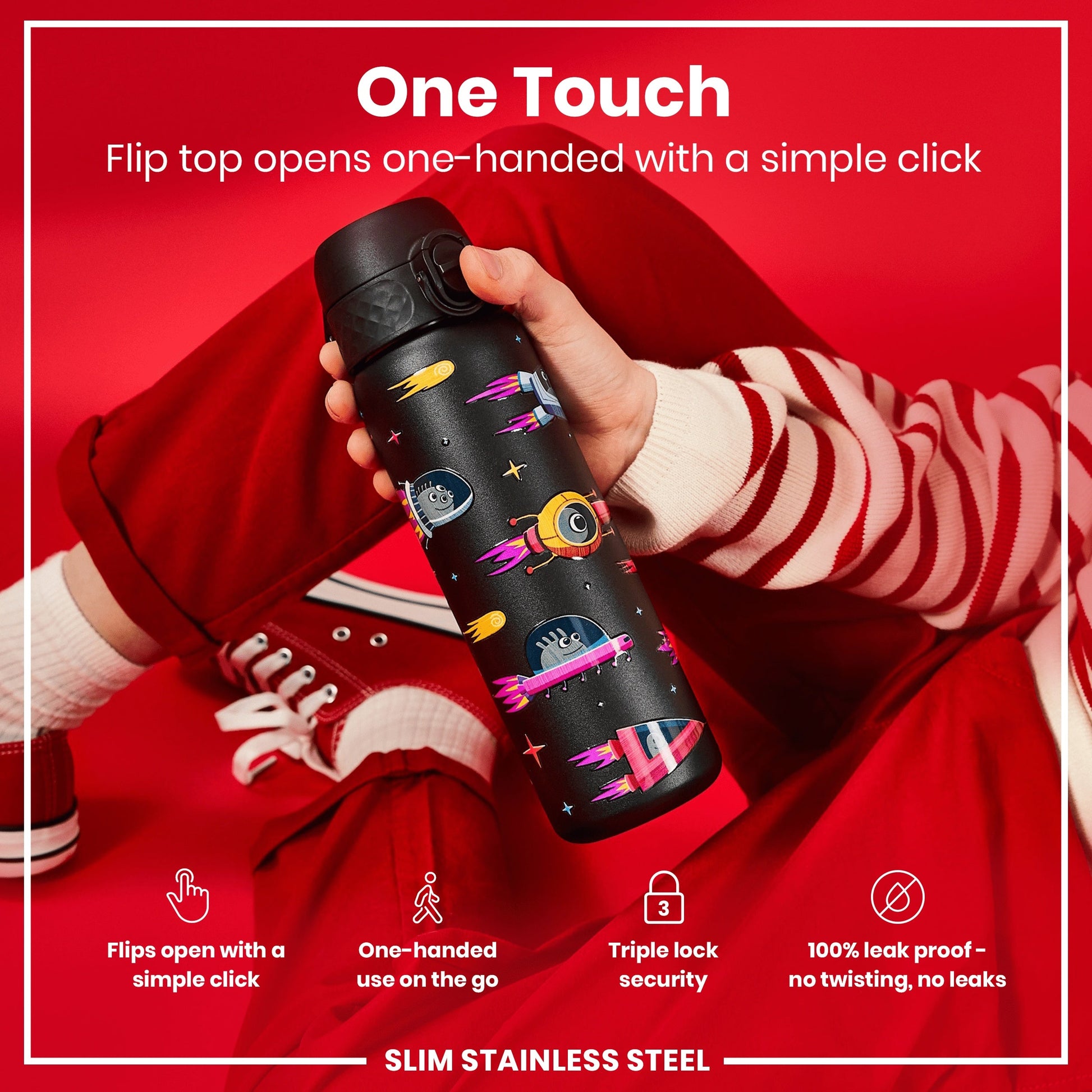 100% leak proof 600ml / 20oz stainless steel water bottles with a smooth flow for spill-free hydration and hygienic full-flip top cover for one handed use on-the-go.