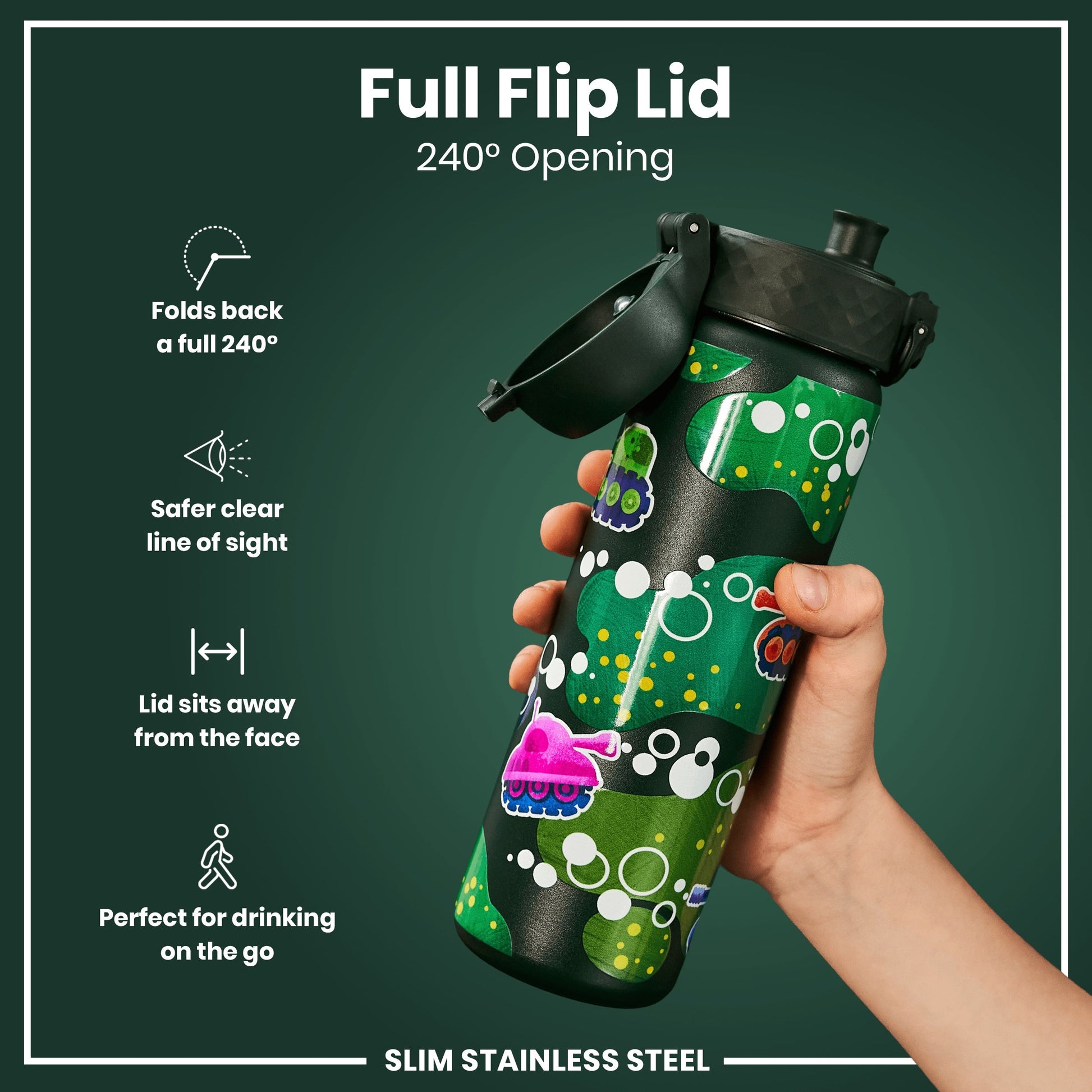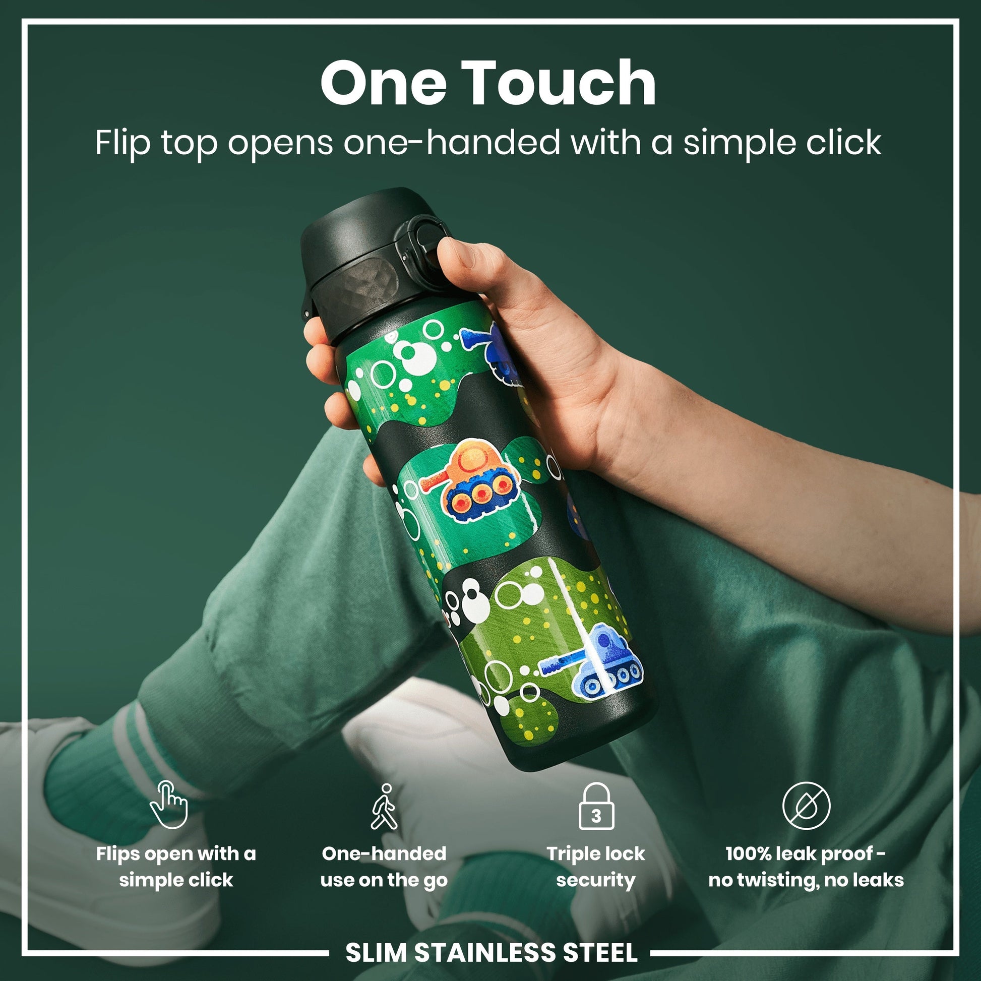 100% leak proof 600ml / 20oz stainless steel water bottles with a smooth flow for spill-free hydration and hygienic full-flip top cover for one handed use on-the-go.