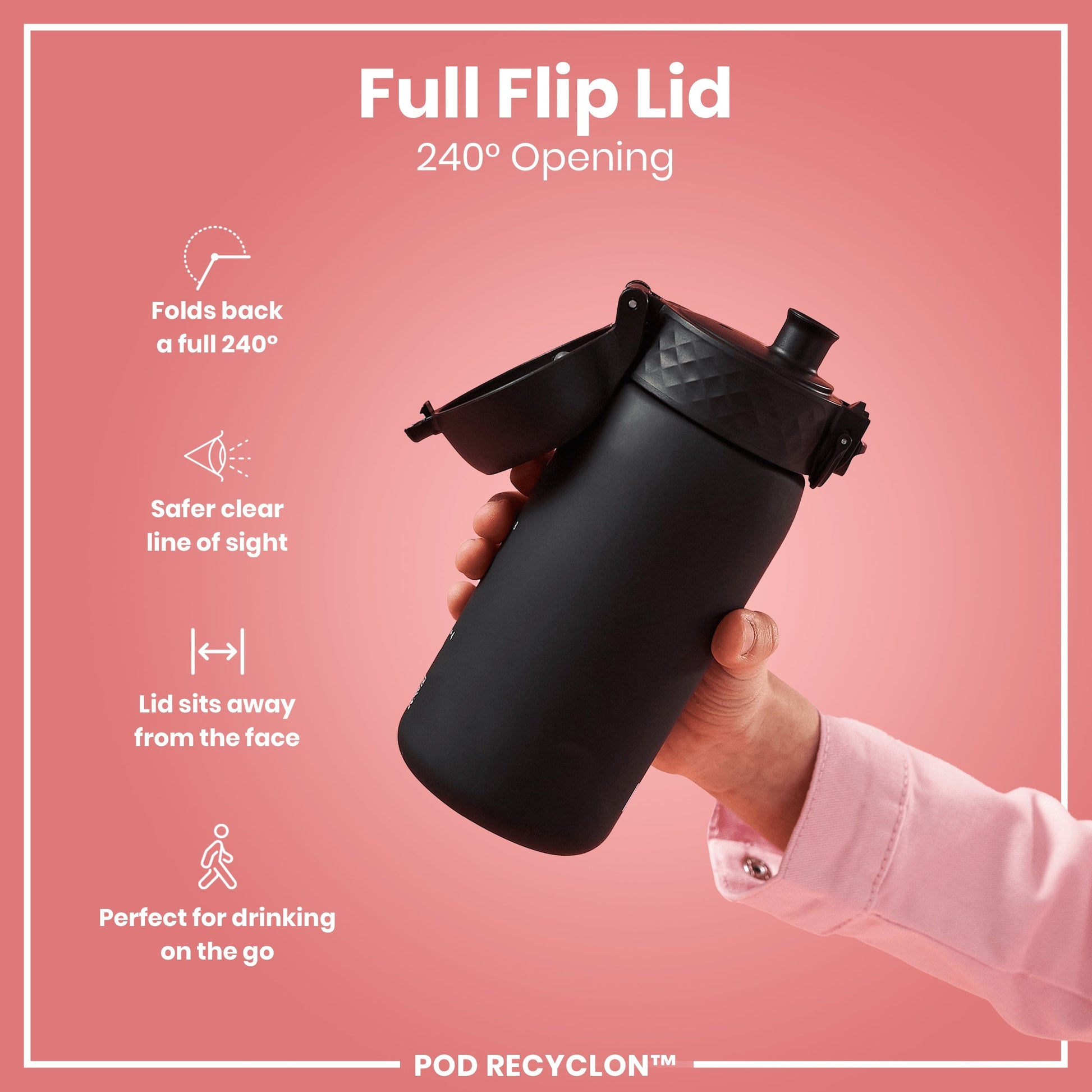 100% leak proof 400ml / 13oz BPA free small black water bottle with straws, with a smooth flow for spill-free hydration and hygienic full-flip top cover for one handed use on-the-go.
