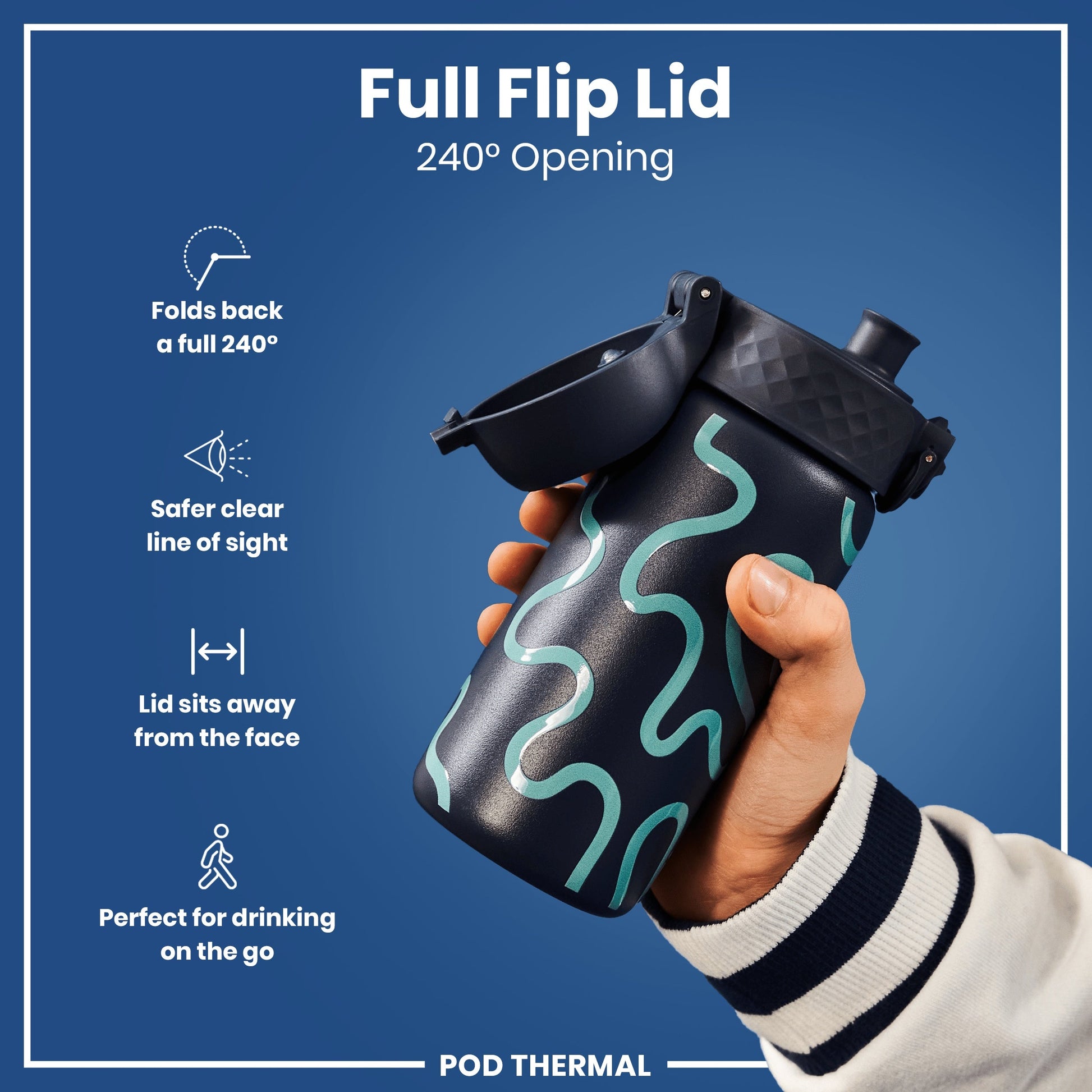 100% leak proof 320ml / 11oz vacuum insulated double wall stainless steel water bottles with a smooth flow for spill-free hydration and hygienic full-flip top cover for one handed use on-the-go. Keeps hot drinks hot and cold drinks icy cold and fresh for hours.