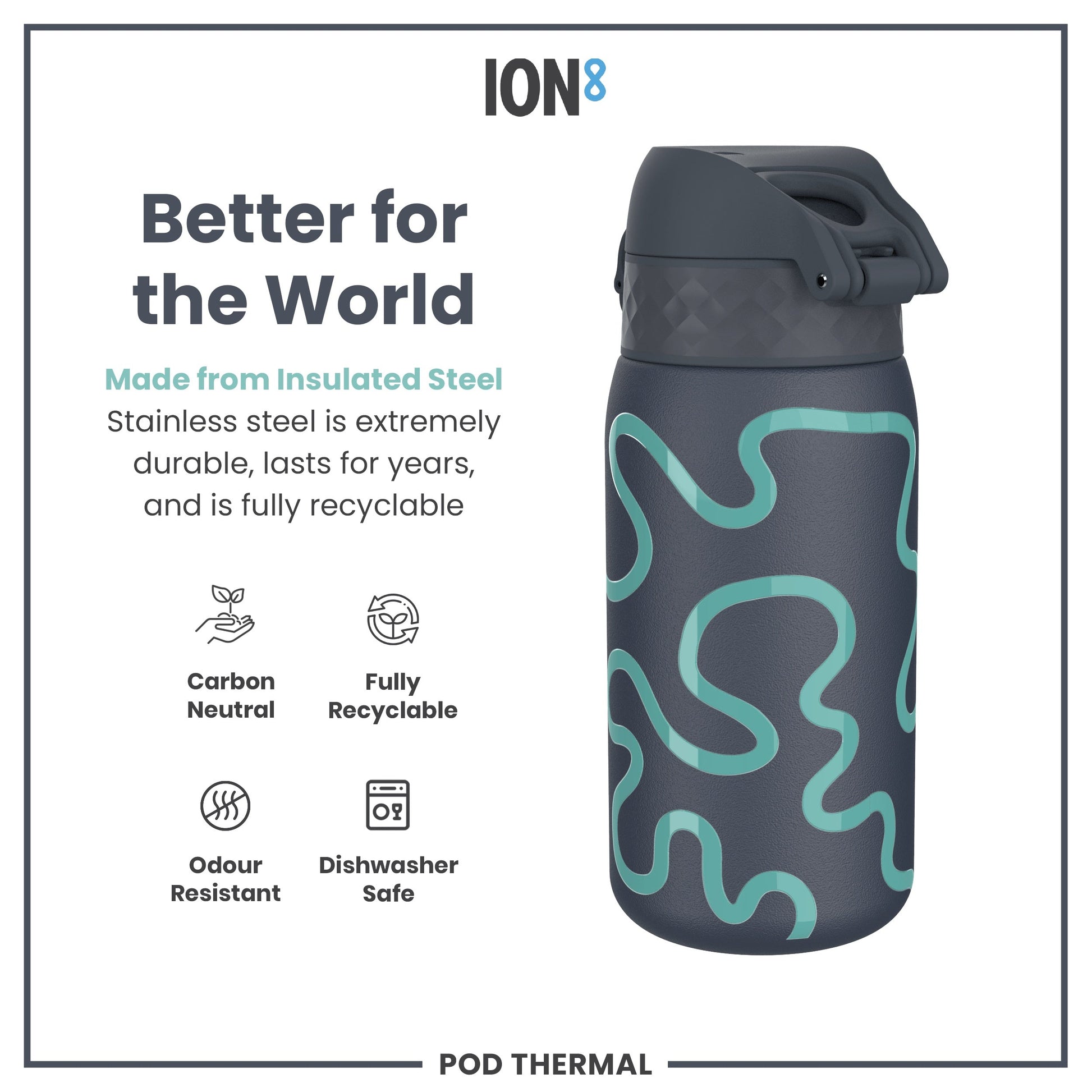 Made from vacuum insulated pro grade ThermoShield stainless steel. Stainless steel is extremely durable, lasts for years, and is carbon neutral and fully recyclable.This refillable and reusable drinks bottle is food safe, odour resistant, easy to hand wash, protects temperature for hours and keeps drinks fresh and full of flavour.