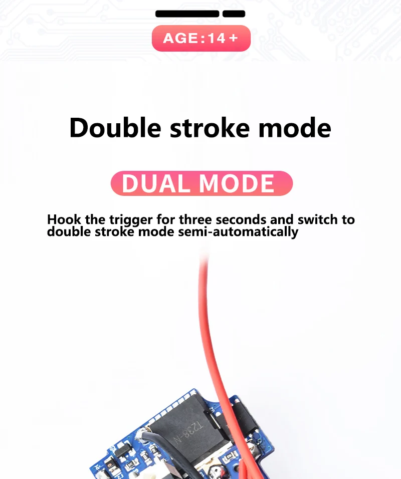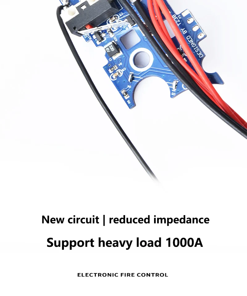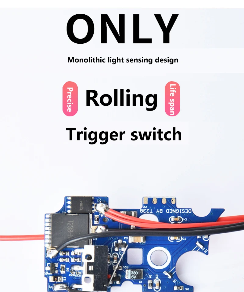Adopts a high-speed processor and 2 high-power MOSFET chips,With binary trigger, automatic loading of gel ball magazine, overheating protection and other functions.With gearbox stall protection.It can effectively improve the stability, shooting speed and response speed of the gearbox.