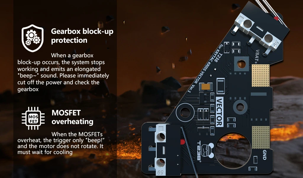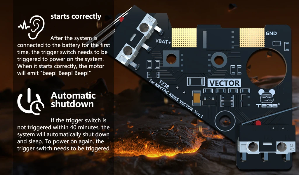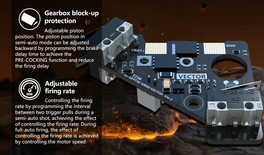 The T238 digital trigger unit VECTOR is a programmable MOSFET electronic module designed specifically for KRYTAC KRISS VECTOR AEG. The system is equipped with a high-speed micro digital processor and two high-power MOSFET chips, and has multiple personalized programmable functions such as active braking, paint-ball shooting mode, binary-trigger, and multiple rounds burst. In addition, it also has automatic shutdown, battery low voltage protection, and gearbox block-up protection functions, which can effectively improve the stability, firing rate, and response speed of the gearbox, and completely eliminate the problem of single shot to multiple shots in the gearbox.