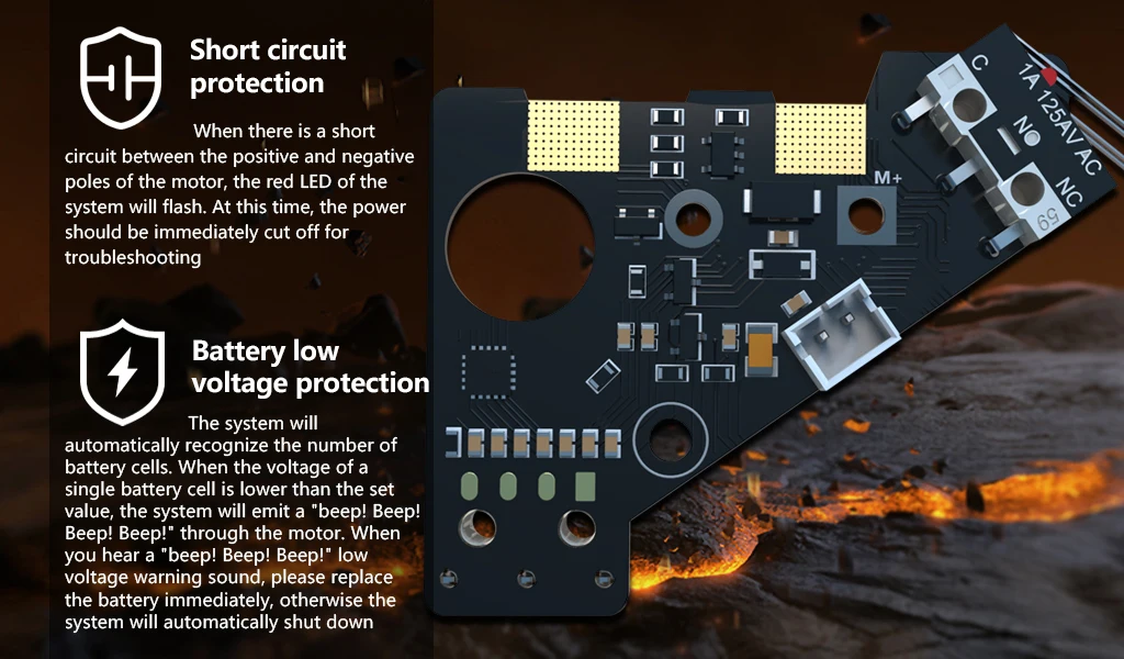1.After the system is connected to the battery for the first time, the trigger switch needs to be triggered to power on the system. When it starts correctly, the motor will emit "beep! Beep! Beep!"