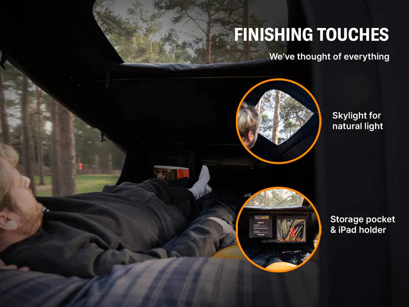 The GO is a lightweight, stripped-back roof tent, designed by TentBox to be affordable and versatile. It comfortably sleeps two people on a stretched fabric bed.