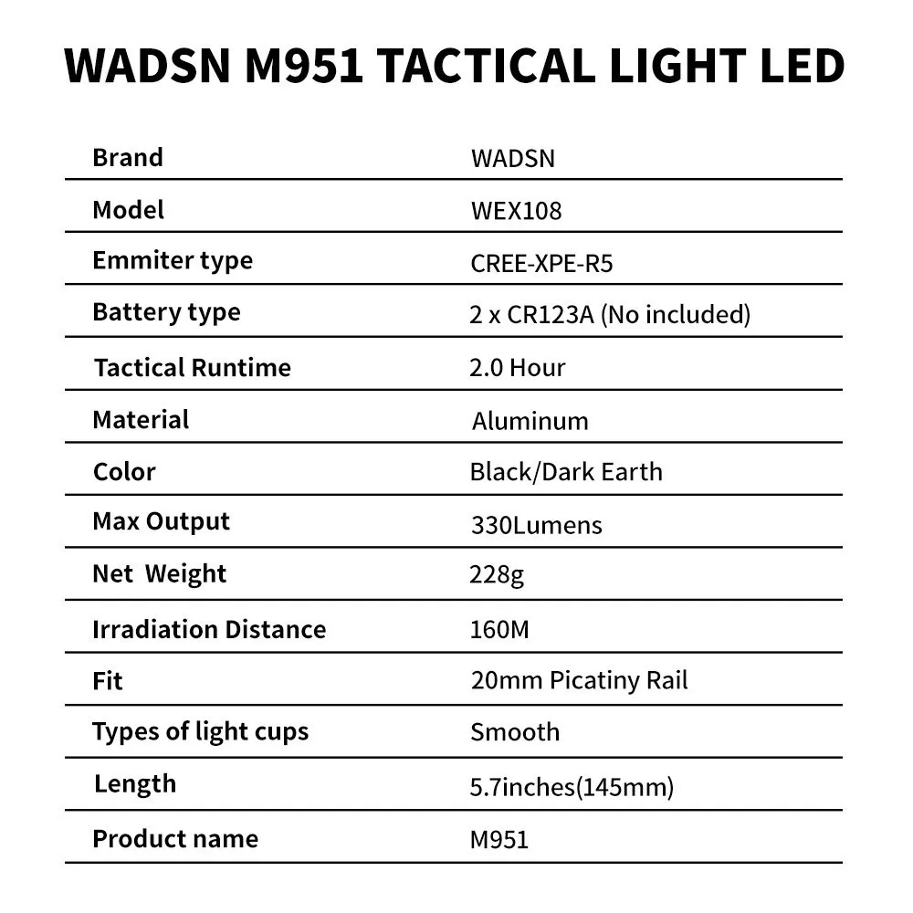 WADSN M951 Metal Tactical Flashlight Airsoft Weapon Accessory Light 600lm Hunting With Pressure Switch Fit 20mm Picatinny Rail